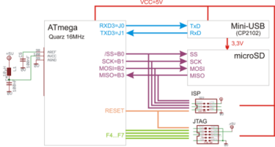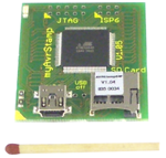 JTAG-, ISP- und Mini USB-Anschluss. Mit dem Micro SD-Kartenhalter stehen